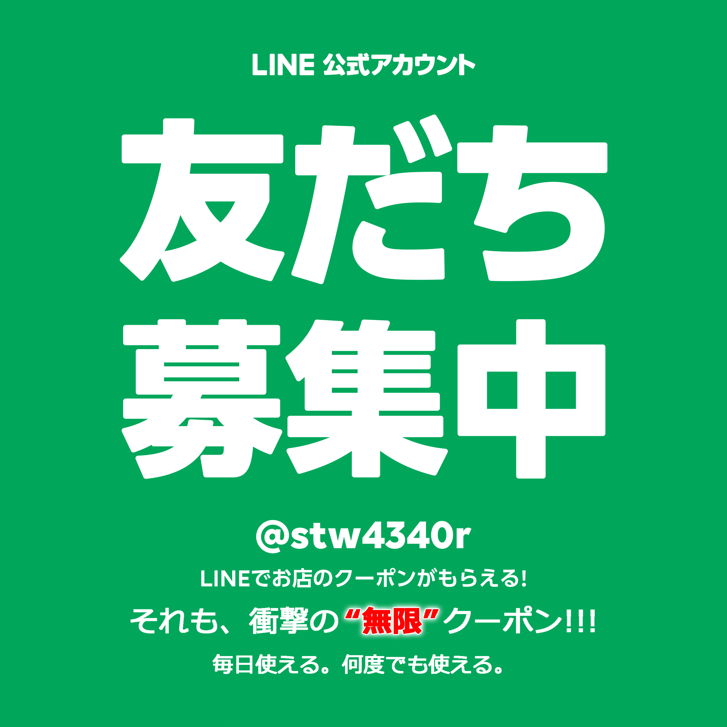 LINE 公式アカウント 友だち募集中 LINEでお店のクーポンがもらえる! それも衝撃の "無限" クーポン!!! 毎日使える。何度でも使える。